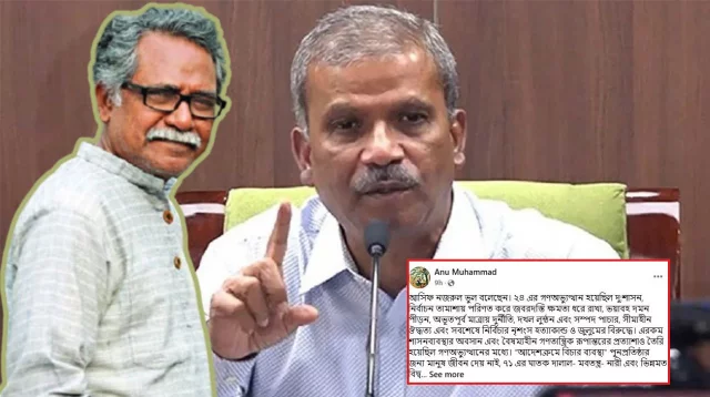 আনু মুহাম্মদ তার পোস্টে লেখেন, ‘আসিফ নজরুল ভুল বলেছেন। ২৪ এর গণঅভ্যুত্থান হয়েছিল দু:শাসন, নির্বাচন তামাশায় পরিণত করে জবরদস্তি ক্ষমতা ধরে রাখা, ভয়াবহ দমনপীড়ন, অভূতপূর্ব মাত্রায় দুর্নীতি, দখল লুণ্ঠন এবং সম্পদ পাচার, সীমাহীন ঔদ্ধত্য এবং সবশেষে নির্বিচার নৃশংস হত্যাকাণ্ড ও জুলুমের বিরুদ্ধে। এরকম শাসনব্যবস্থার অবসান এবং বৈষম্যহীন গণতান্ত্রিক রূপান্তরের প্রত্যাশাও তৈরি হয়েছিল গণঅভ্যুত্থানের মধ্যে।